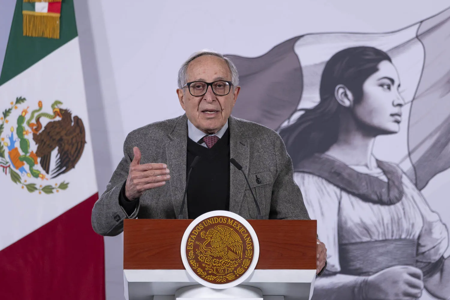 Cuauhtémoc, Ciudad de México. 13 de enero 2026. La presidenta constitucional de los Estados Unidos Mexicanos, la Doctora Claudia Sheinbaum Pardo en conferencia de prensa matutina en el salón de la Tesorería de Palacio Nacional. La acompañan: David Kershenobich, secretario de salud; Eduardo Clark, subsecretario de Integración y desarrollo del sector salud; Martí Batres Guadarrama, director general del Instituto de Seguridad y Servicios Sociales de los Trabajadores del Estado (ISSSTE). Enlace con Zoé Alejandro Robledo Aburto, director general del Instituto Mexicano del Seguro Social; Alejandro Svarch Pérez, director general de IMSS-Bienestar; Alfonso Suárez del Real, asesor político de la Coordinación de Comunicación Social. Foto: Juan Carlos Buenrostro/Presidencia
