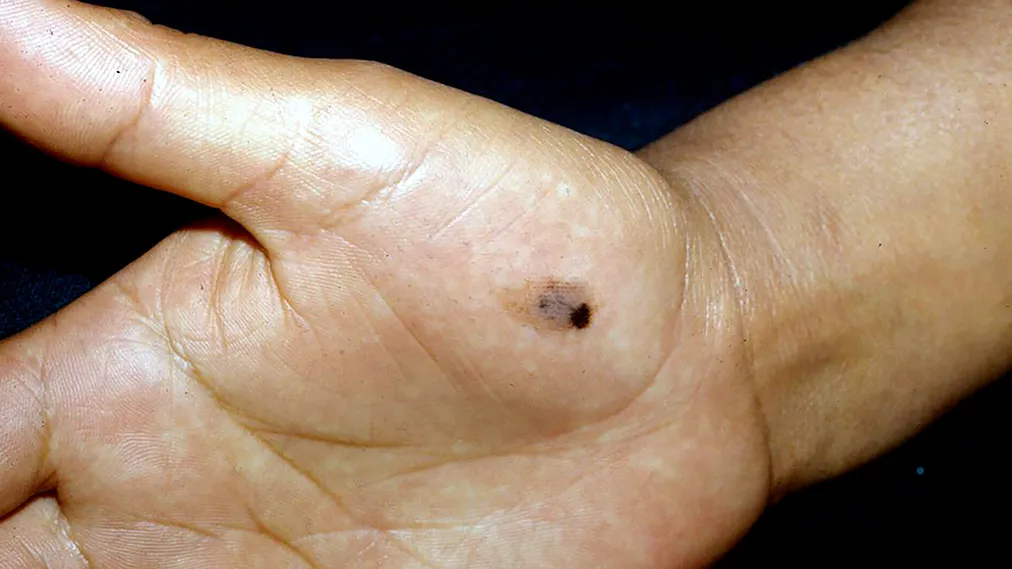 El melanoma acral es un cáncer de piel que se manifiesta como una mancha irregular y oscura en palmas de manos, plantas de pies y bajo las uñas.