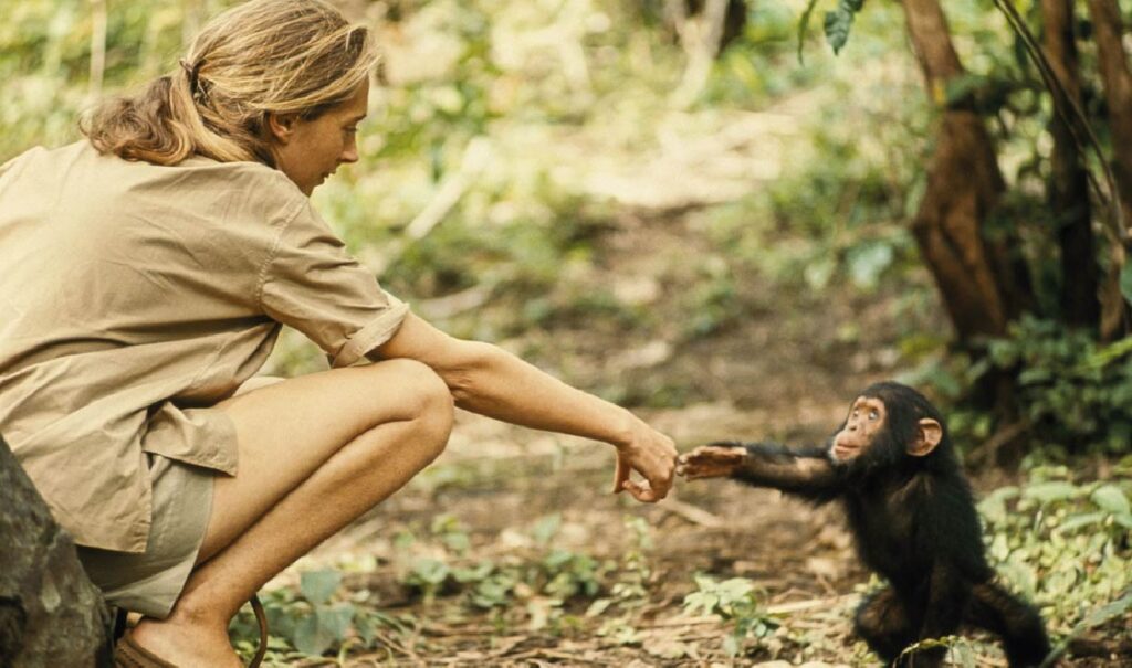 En el Parque Nacional Gombe Stream, a orillas del lago Tanganica en Tanzania, Goodall registró hallazgos que transformaron la primatología: los chimpancés fabrican y usan herramientas, se organizan en redes sociales complejas, establecen alianzas políticas y expresan afectos. Con paciencia infinita narró las vidas de David Greybeard, Flo, Fifi y otros individuos a quienes decidió nombrar, rompiendo con la ortodoxia científica que reducía a números lo que ella veía como personalidades singulares.